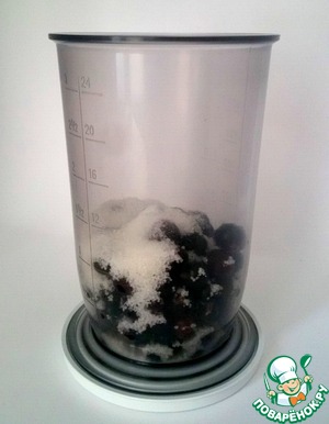 Черную смородину вместе с сахаром помещаем в чашу блендера и доводим до однородного состояния, после чего помещаем в холодильник для загустения.