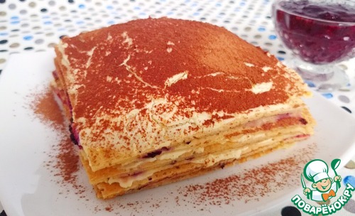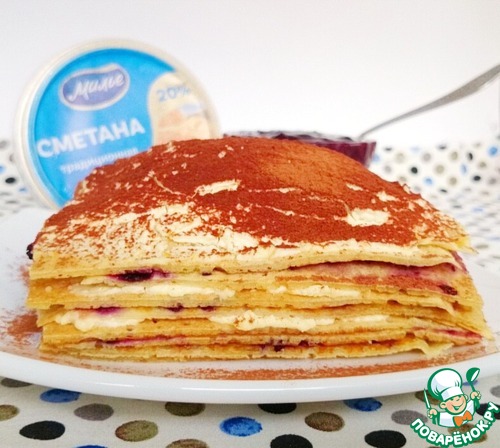 Последний слой лучше сделать творожным. Получившийся блинный мини-тортик можно посыпать небольшим количеством какао-порошка и отправить в холодильник на некоторое время для наилучшей пропитки. После ночи в холодильнике получится нежнейший блинный тортик.