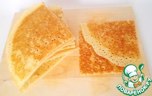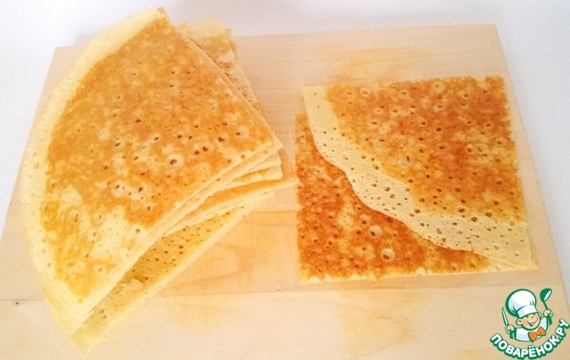 Испеченные по Вашему любимому рецепту блины разрезаем на четвертинки. Из двух уложенных друг на друга уголками в противоположные стороны четвертинок получаем ровный аккуратный квадратик.