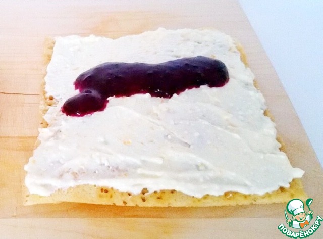 Каждый квадратик промазываем попеременно творожной и ягодной начинками.