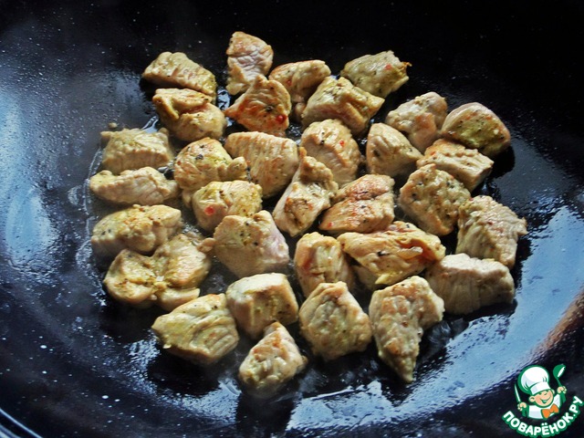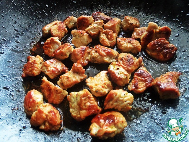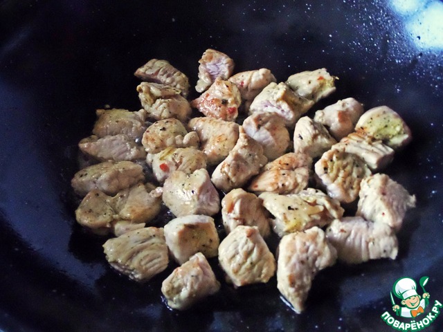 Когда филе настоится (можно на ночь), жарим в воке на оливковом масле. Мы жарили партиями, чтобы сразу подать и съесть. Потом следующую...
