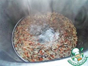 Залить парой стаканов воды, посолить и выставить программу "рис" на 20 минут.