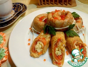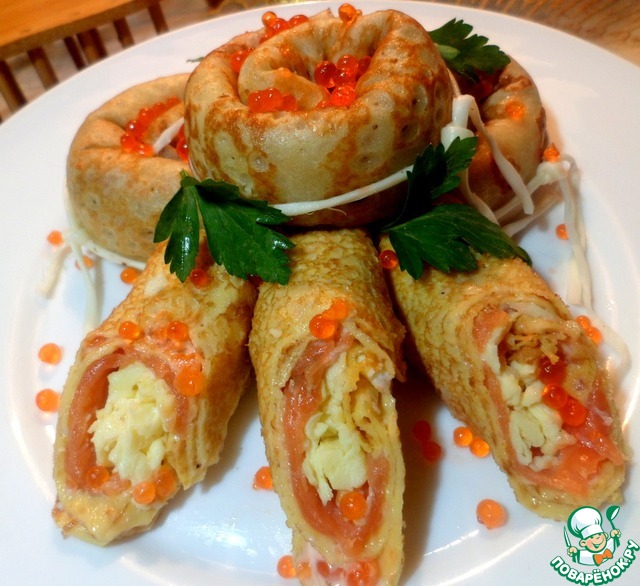 Фаршированные блины с очень вкусной начинкой. Лёгкое тесто, наполненное мелкими пузырьками воздуха, чудесным образом превращается в румяный ажурный блин с мелкими дырочками. Яйцо, приготовленное в виде омлетной массы, в сочетании с малосольной красной рыбой, придает начинке нежность и сочность. В этом рецепте присутствует рыба кижуч, приготовленная лично. Такие блины очень красиво смотрятся на праздничном столе. В моей семье завелась такая традиция, на каждый день Масленицы - новое блюдо из блинов. Этой закуской из блинов, встречаем первый день Масленицы. Угощайтесь и вы вместе с нами.