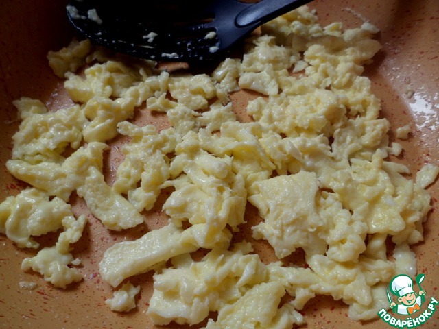 Яйца взбить. Растопить на маленьком огне сливочное масло (20г) на сковороде. Выливаем яичную смесь. И, как только по краям начнет закручиваться омлет, начинаем его быстро перемешивать, чтоб получилась яичная масса. Таким способом приготовления яиц, начинка получатся нежная и сочная.