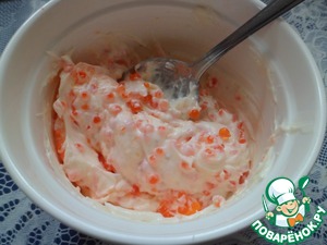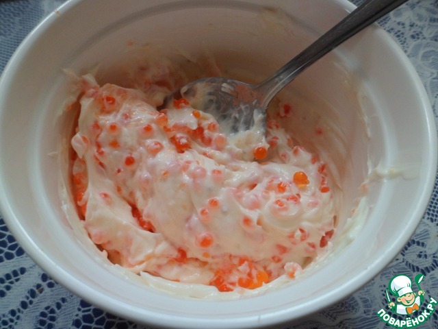 Смешать майонез (сметану или йогурт) с икрой. У меня майонез домашний.