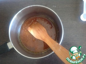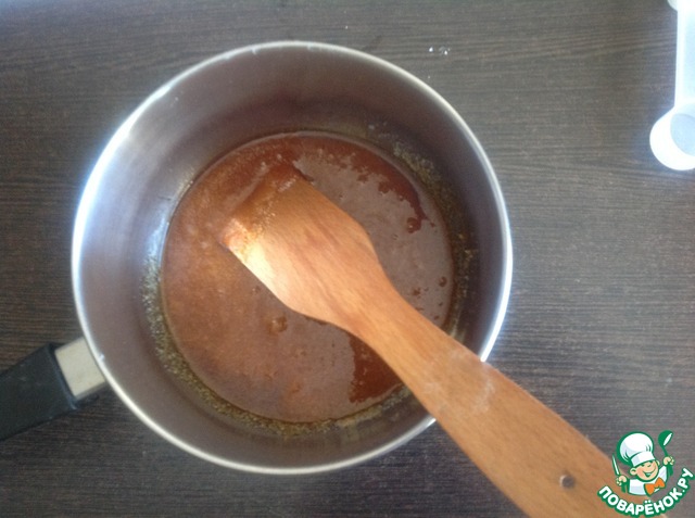 В небольшую кастрюльку всыпать сахар и нагревать на среднем огне до его полного растворения, помешивая деревянной лопаткой, не допуская подгорания.