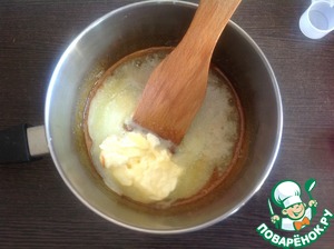 Как только сахар полностью расплавится и приобретёт янтарный цвет, добавить сливочное масло комнатной температуры. Будьте внимательны, так как карамель очень быстро запузырится. Масло вмешать в сахар и варить, помешивая, 2-3 минуты.