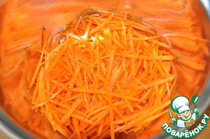 Морковь моем, чистим и натираем на специальной тёрке тонкими полосками.