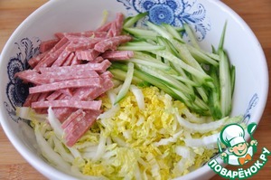 Для приготовления салата: сервелат, огурец и пекинскую капусту режем тонкой соломкой. Слегка перемешиваем.