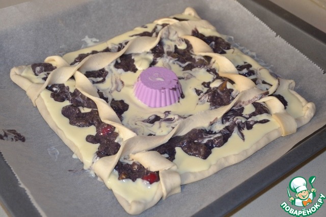 Кладем тесто на кондитерскую бумагу, вырезаем квадрат 30х30, можно немножко больше. Края подворачиваем рулетиком, чтобы сделать бортики. В серединке прорезаем крестик и заворачиваем уголки рулетиками, чтобы образовалась дырка.