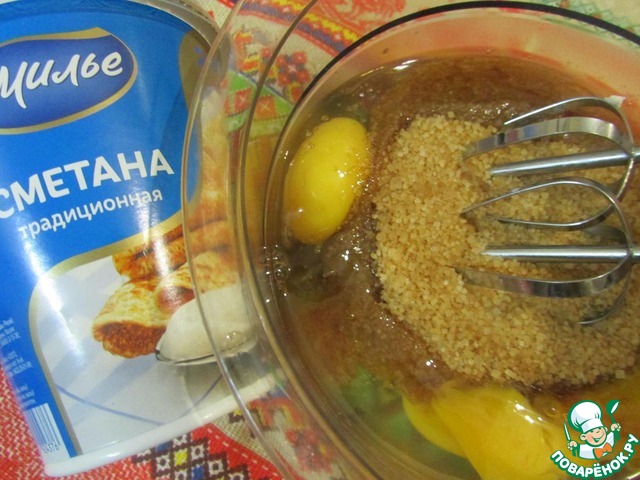 В отдельной миске взбить сахар и яйца, до легкой пены.