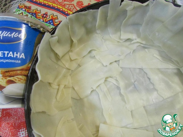 Отварить листы лазаньи согласно инструкции на упаковке (я отвариваю небольшими партиями, 5-6 листов, вынимаю шумовкой и раскладываю на тарелку по отдельности, чтобы не слиплись). Форму для выпечки (24 см) слегка смазать сливочным маслом, присыпать мукой. Проложить дно и бортик формы листами лазаньи без промежутков, слегка внахлест (можно их рвать ).