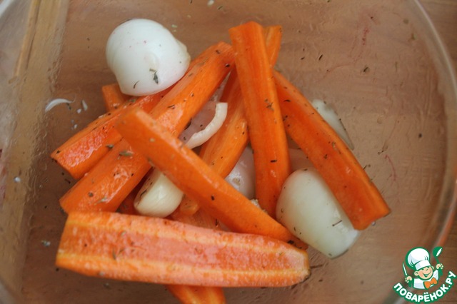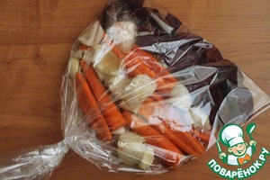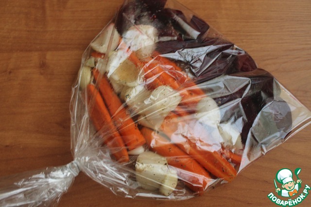 • В рукав для запекания в один слой выкладываем овощи, поливаем оставшимся соусом. Закрываем рукав, делаем в нем несколько проколов. Запекаем при 200 градусах 20 минут, потом уменьшаем температуру до 180 градусов и готовим еще 20 минут.