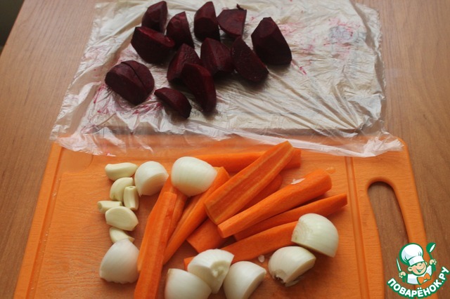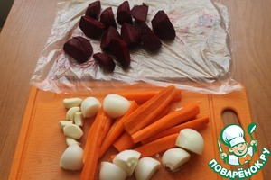 • Морковь и свеклу вымыть, очистить от кожуры и разрезать на некрупные кусочки. Чеснок также очистить и разобрать на зубчики, лук очистить и порубить на четвертинки.