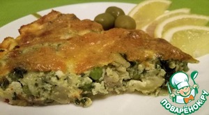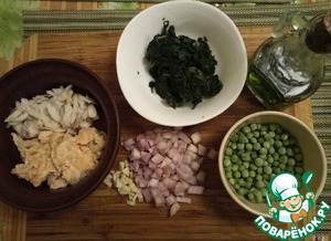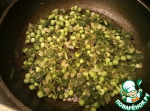 В сковороде на оливковом масле обжариваем до прозрачности лук с чесноком, добавим горошек. На этом этапе можно присолить, чтобы не пригорело и пустило сок. Туда же отправляем на пару минут шпинат, снимаем с огня, даем остыть.