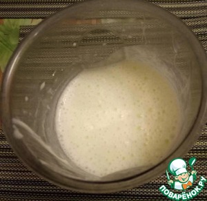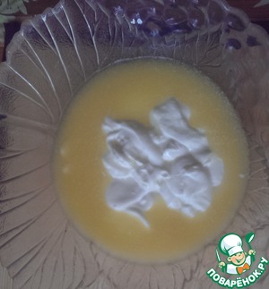Для этого смешаем сливки ( у меня сливки жирные базарные) с молоком, и взбивая, добавим поочередно яйца. Продолжаем взбивать всю массу до приобретения нею легкости и пышности. -