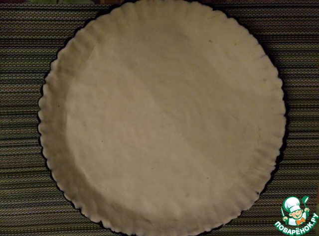 Достаем из холодильника тесто. Форму смазываем оливковым маслом и распределяем тесто толщиной около 2 мм.