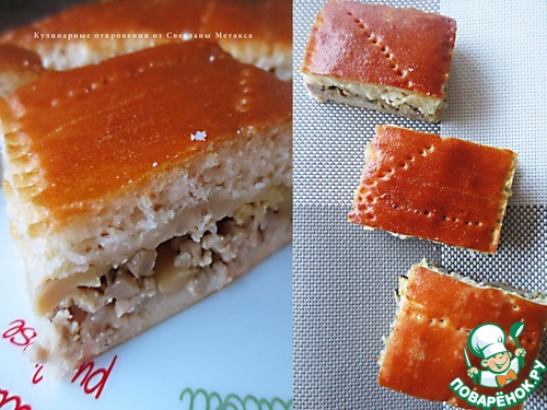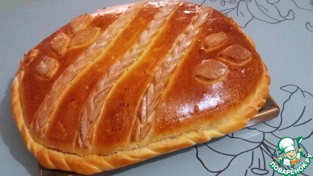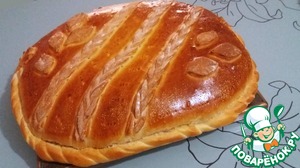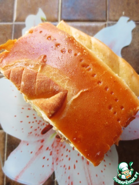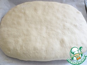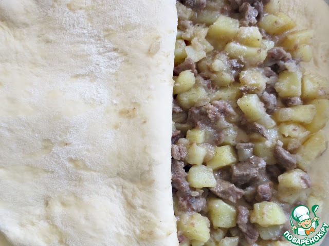 Из каждой части раскатать овальную лепешку. На нижнюю лепешку положить равномерным слоем начинку, накрыть верхней лепешкой