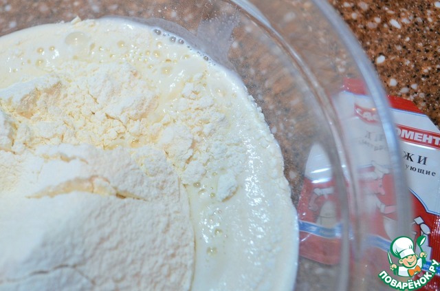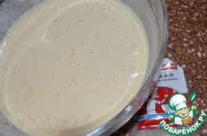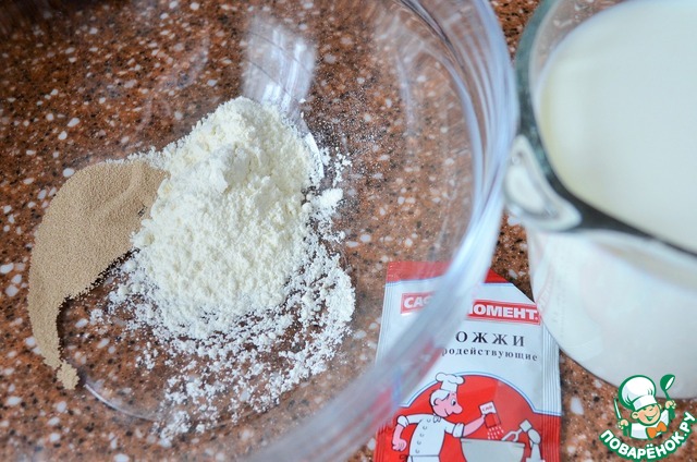 • Из сахара, 2 ст. л. муки ( из общего веса), дрожжей и 100 мл. молока ( из 600 мл. ) поставить опару. Для этого все смешать и оставить на 30 минут в теплое место, ждем "шапочку".