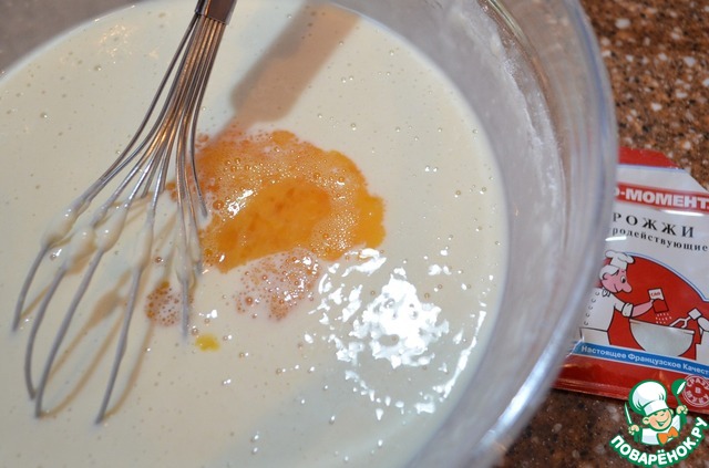 • Белок и яйцо с солью взбить венчиком и влить в тесто.