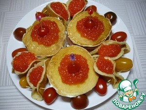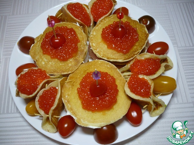 Cверху выложить кусочек слабосоленой кеты, накрыть другим блинчиком, снова намазать слой сливочного сыра и выложить кусочек кеты. Накрыть еще блинчиком и закрепить все шпажкой. Сверху украсить половинкой помидора черри и красной икрой. Все повторить с остальными канапе, соблюдая заданную последовательность.