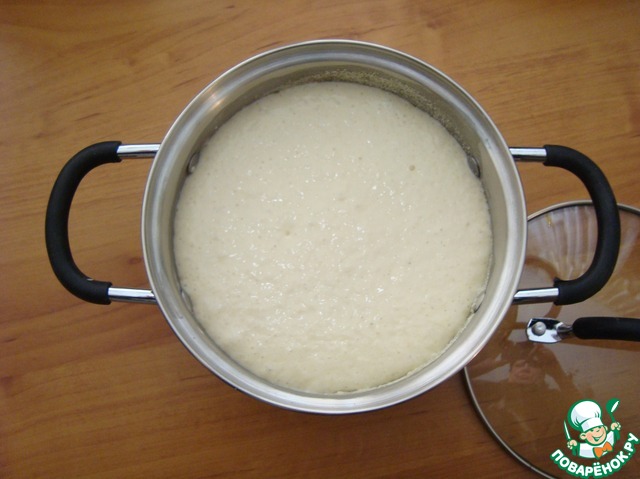 Соединяем, накрываем крышкой и ставим в тёплое место на 40 минут. Я для этого немного грею духовку.