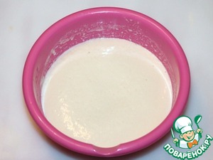 1. Приготовим опару. В теплое молоко (t 40С) добавить дрожжи (1. л.), сахар (2 ч. л.) и 3 ст. л. муки., хорошо размешать венчиком. Ставим миску с тестом в теплое место до образования пенной шапочки.