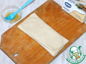 7. После увеличения, тесто обмять и раскатать в прямоугольник ~30*18, толщиной 0,5 см. Смазать растопленным или мягким маслом 2/3 части пласта.