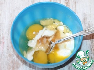12. За это время приготовим заливку. Смешиваем яйца со сметаной, добавляем щепотку соли, 1 ст. л. сахара, ванилин и если осталось растопленное масло.