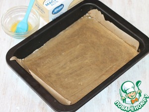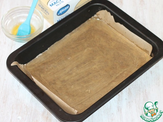 13. Застилаем форму для выпечки (22*28) пищевой бумагой, смазываем маслом.