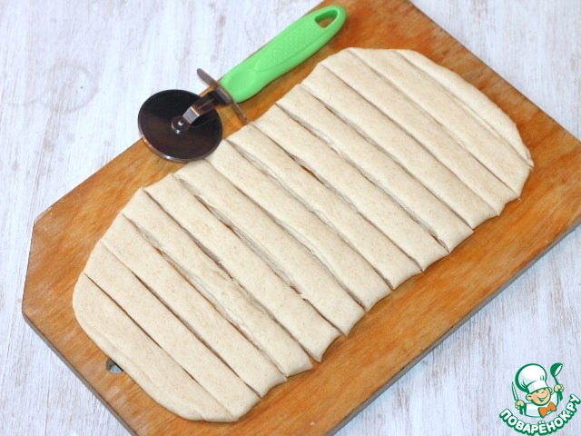 14. Раскатываем тесто в прямоугольную форму тол.0,5 см и вырезаем полоски шириной 2, 5 см, длиной 18 см.