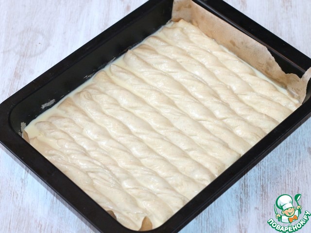 15. Каждую полоску теста аккуратно скручиваем, стараемся не вытягивать тесто, и укладываем в форму.