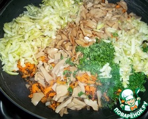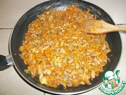Лук мелко нарезать, морковь и яблоко натереть на средней терке, если грибы крупные - нарезать, свежую зелень порубить. В сковороде разогреть раст. масло, немного припустить лук, добавить морковь, обжаривать, помешивая, 5 минут.