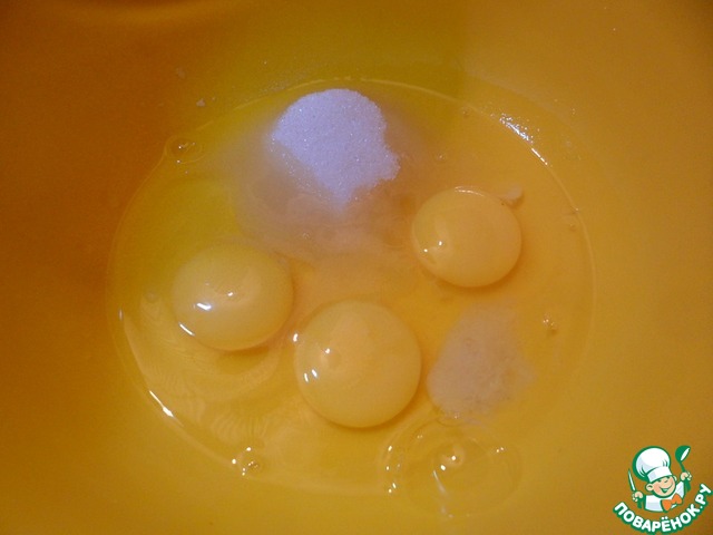 В миску разбиваем яйца, добавляем соль и сахар и взбиваем миксером до увеличения объема в два раза.