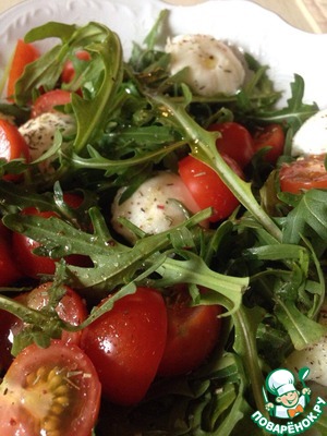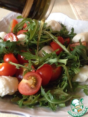 Осталось только в большую глубокую тарелку выложить рукколу, моцареллу и подмидорку черри. Полить оливковым маслом и добавить специи по вкусу. Я всегда добавляю итальянские травы:)
