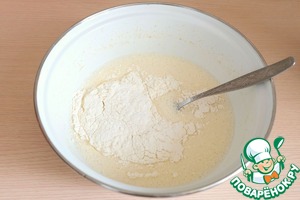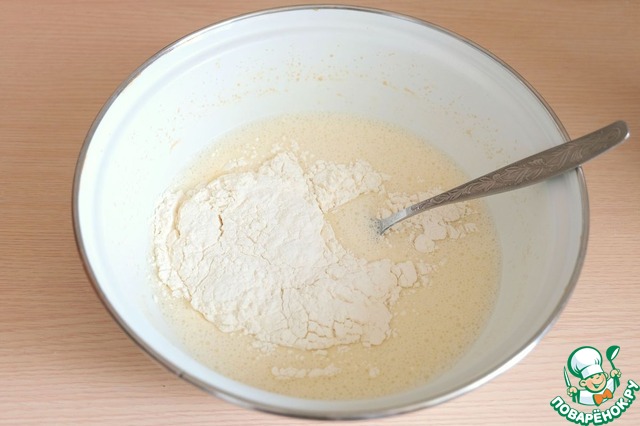 Из общего количества муки взять 1 ст. ложку и добавить в масляно-молочную смесь. Смесь накрыть пищевой пленкой или куском ткани и поставить на несколько минут в теплое место. -