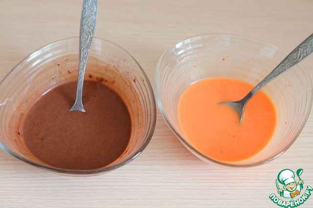 В 2 миски налить равное количество теста (примерно 1-2 ст. ложки). В одну миску добавить какао-порошок (1 ч. ложка без горки), во вторую - пищевой краситель. Обе смеси хорошо размешать до полного растворения составляющих.
