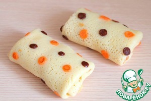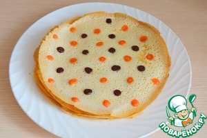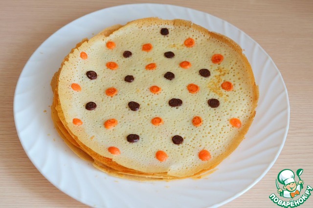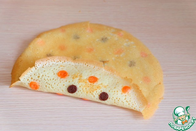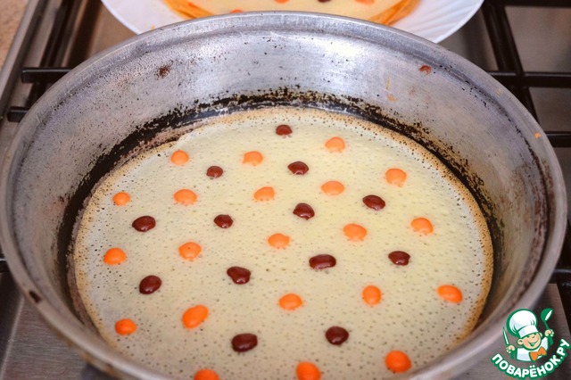 Тесто готово, можно приступить к выпеканию блинов. На разогретую на среднем огне сковороду налить основное светлое тесто, дать немного схватиться, убавить огонь, затем нанести цветное тесто в виде горошин, чередуя шоколадное и окрашенное пищевым красителем тесто.