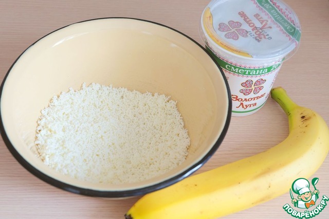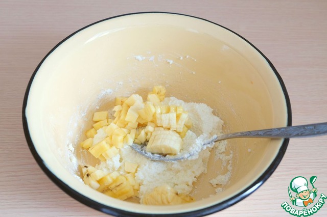 Нарезать кусочками банан. Добавить кусочки банана в смесь творога и сметаны (1 ст. ложка). Творожно- банановый фарш вымешать.