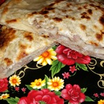 Затем формируем из начинённой четвертинки круглую лепёшку и раскатываем ещё раз. Вот у меня немного разорвалась. Надо раскатывать очень осторожно и стараться посильнее слеплять края.