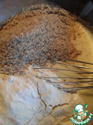 Просеиваем муку. Добавляем к тесту муку, соду и орехи. Орехи должны быть молотые.