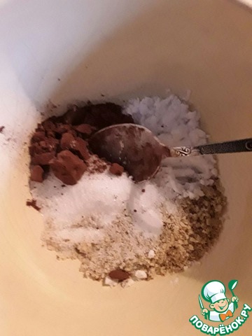 А теперь готовим крем. Соединяем орехи, крахмал, сахар и какао. Можно делать и без какао.
