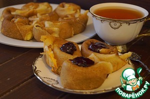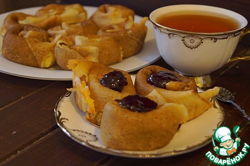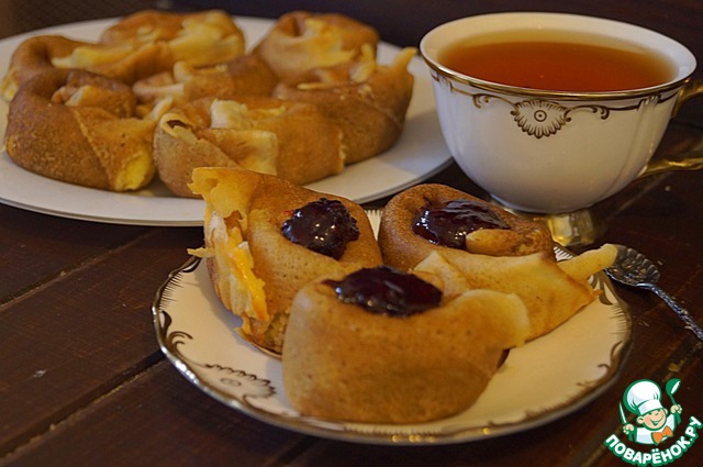 На готовые блинчики нужно положить в центр немного варенья или джема. Подавать к столу.