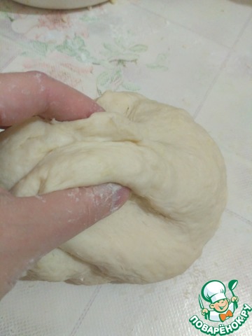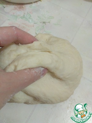 Далее насыпаете постепенно 500 гр муки и вымешиваете ложкой. Как только стало тяжело мешать ложкой, добавляете масло и вымешиваете руками. Тесто не будет прилипать к рукам, присыпать мукой не нужно.