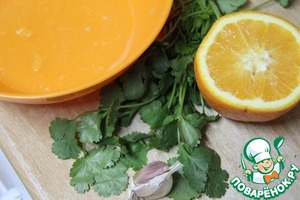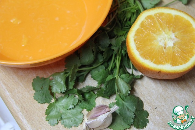 Готовим маринад: выдавливаем сок апельсина, мелко режем кинзу.