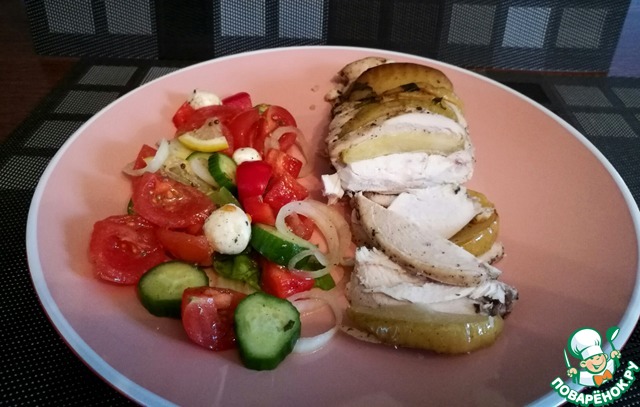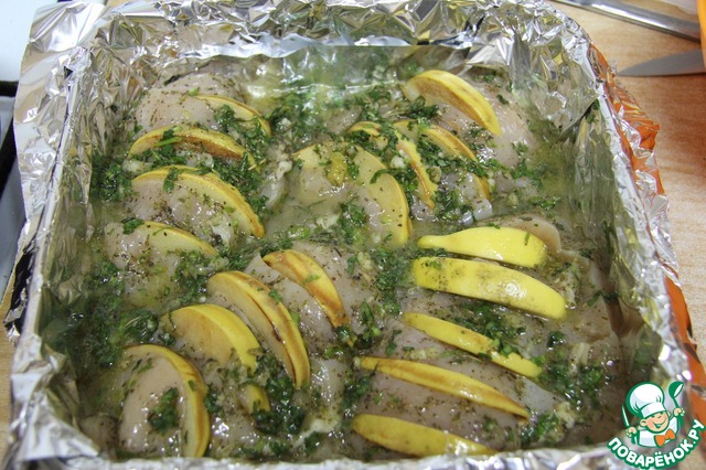 Грудки, перед запекание, надрезать острым ножом и вложить в разрезы дольки айвы. Выложить в форму грудки и добавить оставшийся маринад. Накрыть форму фольгой и поставить в духовку (180 градусов) на 20-30 минут. По истечении этого времени удалить фольгу и запечь еще несколько минут (у меня все время приготовления заняло 50 минут). Проверить очень просто: сделать прокол ножом и оценить выделившуюся жидкость. Если прозрачный сок - грудка готова, если розовый - доведите до готовности).