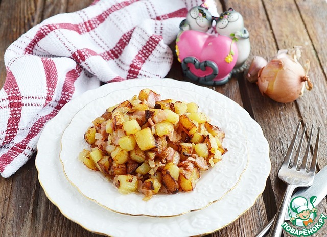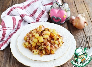 Раздвиньте картофель по краям сковороды, оставляя место в центре. Выложите в центр нарезанный кубиками лук. Обжаривайте всё до золотистости лука.