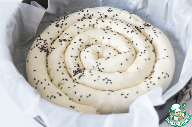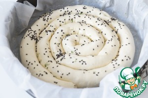 Сложить рулетики в форму, скрепить их, формируя пирог. Смазать яйцом, присыпать кунжутом.