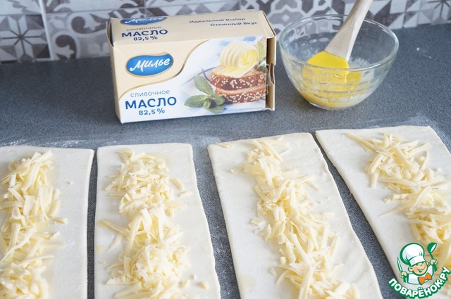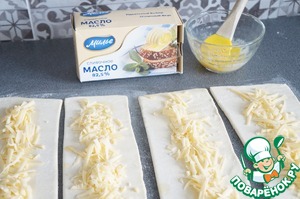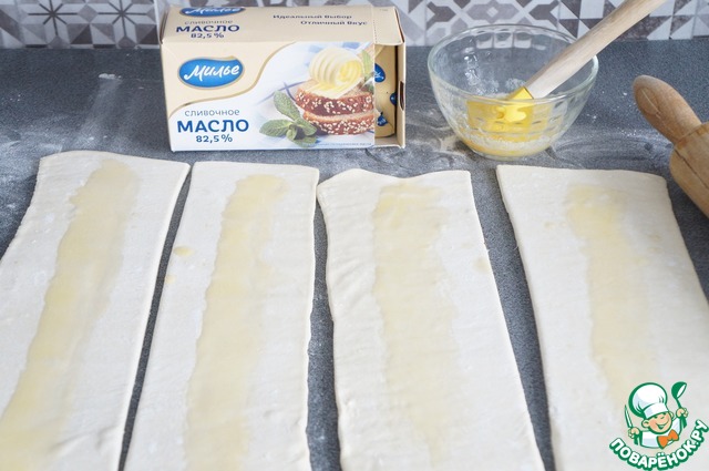 Масло растопить. Тесто слегка раскатать (в одном направлении), нарезать на полосы. Смазать маслом.