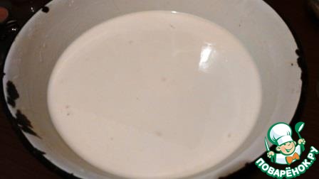 И соединить с мукой. Опять все хорошо перемешать. Тесто начинает густеть и вот теперь можно добавить оставшееся молоко и воду. Я делаю смесь из воды и молока, т. к. мне так вкуснее, исходя их опыта выпечки обычных блинов. Все хорошо перемешать, чтобы не было комочков, накрыть полотенцем и оставить подходить на 30 минут. Тесто по консистенции похоже на жидкую сметану, в принципе ни чем не отличается от обычного блинного теста.